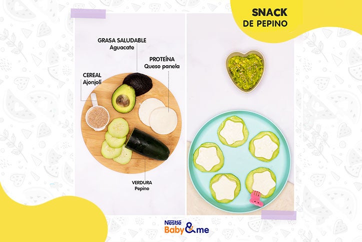 Limpia el pepino y córtalo en rebanadas. Coloca un pedazo de queso, puedes cortarlo en forma de estrella o corazón para hacerlo más divertido y acompañalo con un dip de guacamole.