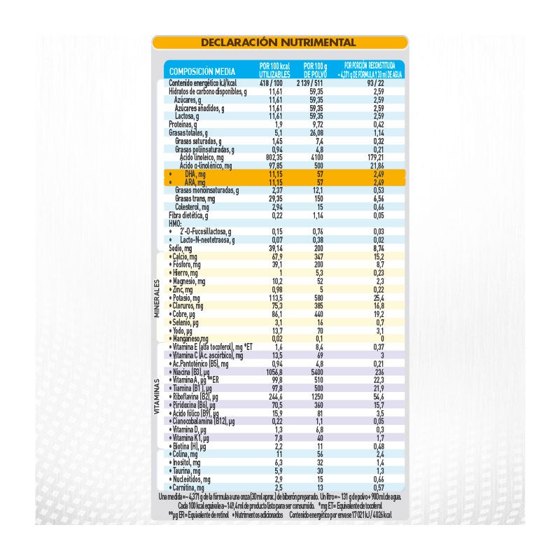 Azúcares añadidos (lactosa), concentrado de proteína de suero de leche parcialmente hidrolizada enzimáticamente, aceites vegetales (girasol alto oleico, coco, canola y girasol), fosfato de calcio, HMO 1,25% (2'FL: 2'-O-fucosillactosa y LNnT: Lacto-N-neotetraosa), cloruro de magnesio, cloruro de potasio, L-arginina, aceite de pescado 0,26% (DHA), fosfato de potasio, aceite de Mortierella alpina 0.14% (ARA), cloruro de sodio, L-histidina, bitartrato de colina, L-tirosina, vitamina C (ascorbato de sodio), taurina, inositol, sulfato ferroso, tripsina, L-carnitina, sulfato de zinc, nucleotidos, vitamina B5 (ácido pantoténico), vitamina B3 (niacina), L-palmitato de ascorbilo, vitamina E (DL-alfa tocoferol), ácido cítrico, cultivos probióticos de Bifidobacterium lactis 0,003%, sulfato de cobre, vitamina B2 (riboflavina), vitamina A (acetato de retinol), vitamina B1 (tiamina), vitamina B6 (piridoxina), sulfato de manganeso, yoduro de potasio, vitamina B9 (ácido fólico), vitamina K1 (fitomenadiona), selenato de sodio, biotina, vitamina D3 (colecalciferol) y vitamina B12 (cianocobalamina).