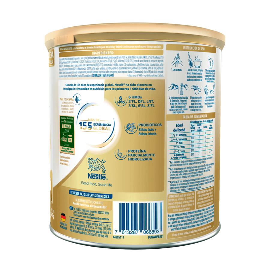 Azúcares añadidos (lactosa), aceites vegetales (girasol alto oleico, canola y girasol), proteína parcialmente hidrolizada enzimaticamente de suero de leche (10,25 %), fosfato dibásico de potasio, HMO (1,53%) [2'-fucosillactosa (2'FL) (0,74%), lacto-N-tetraosa (LNT) (0,3%), 3'-fucosillactosa (3-FL) (0,2%), 6'-sialillactosa (6'-SL) (0,12%), difucosillactosa (DFL) (0,1%) y 3'-sialillactosa (3'SL) (0,07%)], citrato de calcio, bitartrato de colina, aceite de pescado (DHA) [0,4%], cloruro de magnesio, cloruro de potasio, L-arginina, aceite de Mortierella alpina (ARA) [0,21%], cloruro de sodio, L-histidina, vitamina C (L-ascorbato sódico), L-fenilalanina, inositol, L-taurina, tripsina, sulfato ferroso, probióticos Bifidobacterium infantis (0,02%) y Bifidobacterium lactis (0,001%), sulfato de zinc, nucleótidos, L-carnitina, vitamina B5 (d-pantotenato cálcico), vitamina B3 (nicotinamida), sulfato de cobre, vitamina B2 (riboavina), vitamina A (acetato de retinilo), vitamina B1 (tiamina mononitrato), vitamina B6 (hidrocloruro de piridoxina), sulfato de manganeso, yoduro de potasio, vitamina K1 (tomenadiona), vitamina B9 (ácido fólico), selenato de sodio, vitamina H (d-biotina), vitamina D3 (colecalciferol) y vitamina B12 (cianocobalamina).