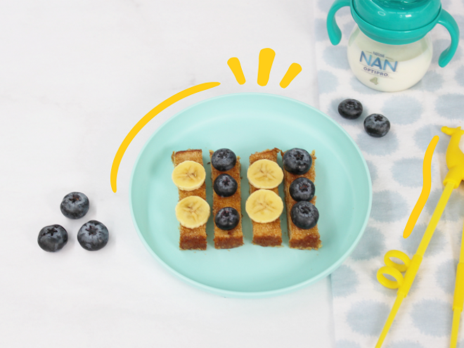 Para que sea más práctico, cortar el pan en 4 tiras para que a los niños les sea más fácil agarrar.